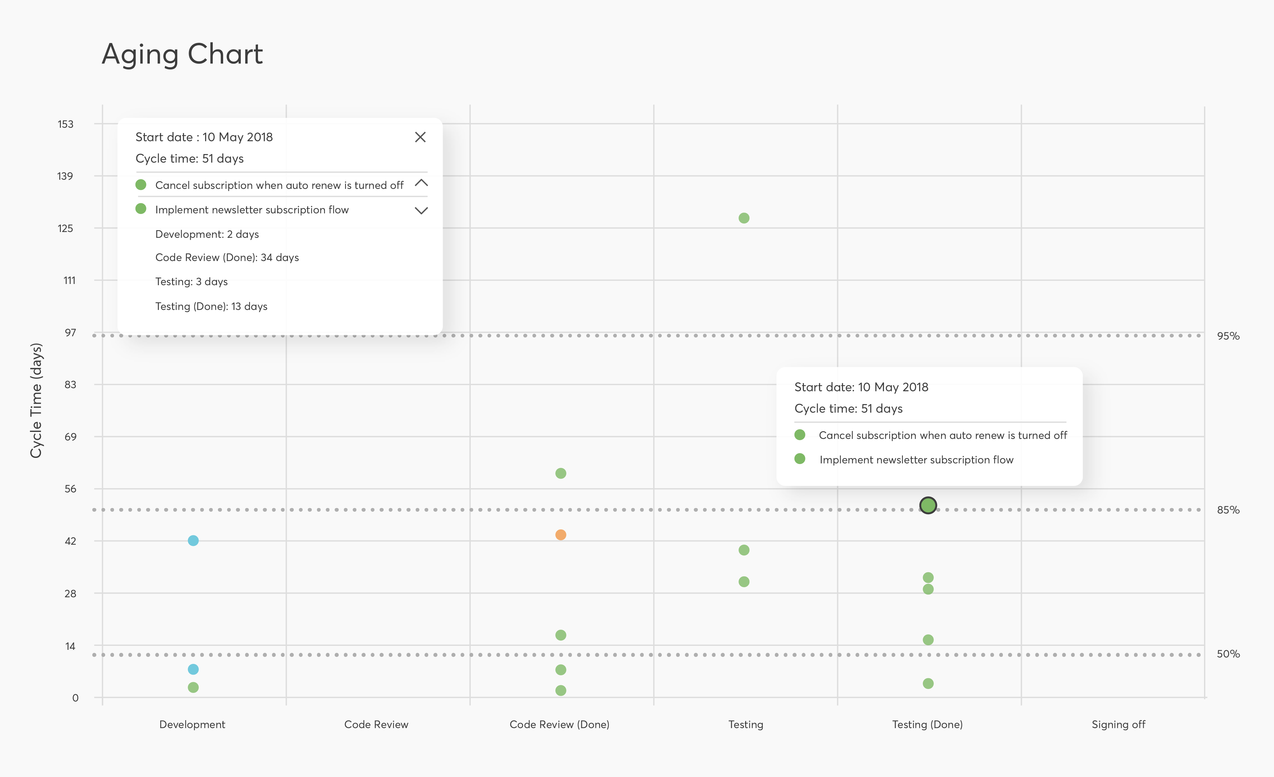 The Aging Chart extracts data from your Kanban board and provides a concise, visual summary of your flow. The chart gives you an indication of how your team has performed in similar contexts in the past. The higher the cycle time, the larger the chance of delay.