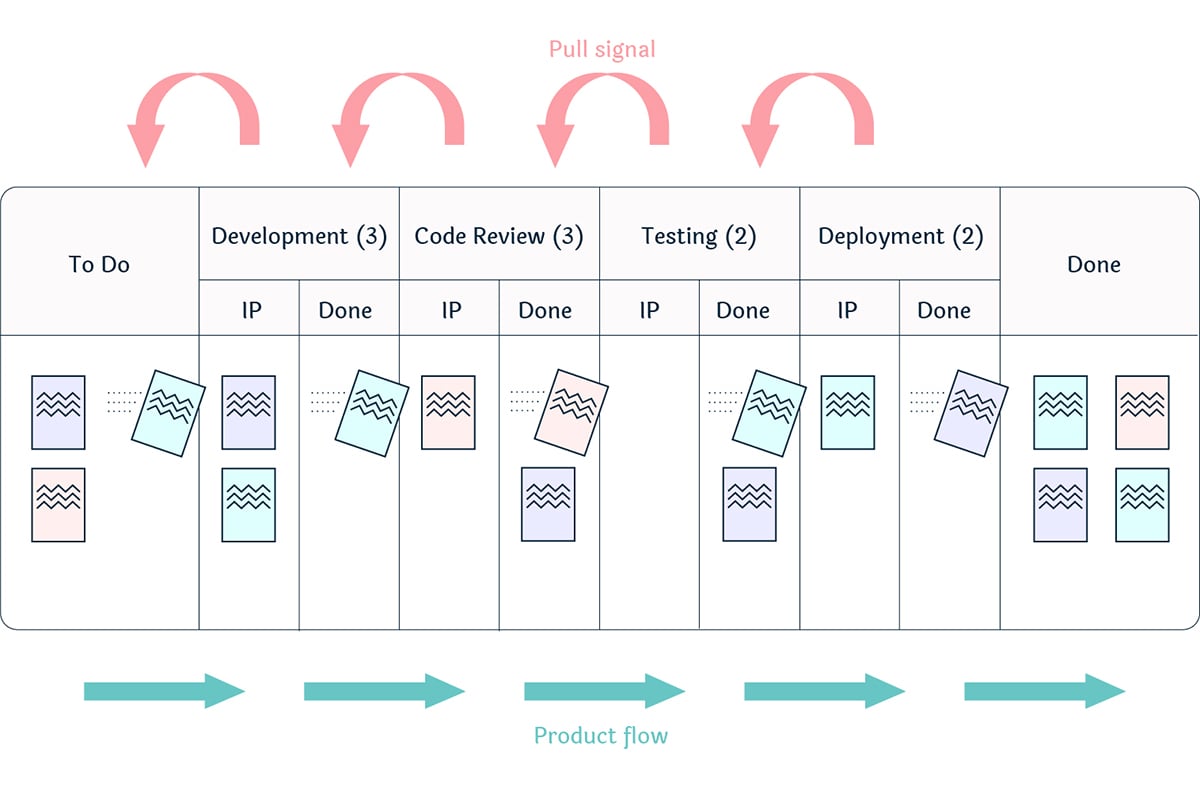 In a pull system, management defines the priority of a task by assigning classes of service before placing it in the To Do column. Once the delivery team has an empty slot for new work, they pull the task in the process. This is the point of commitment.